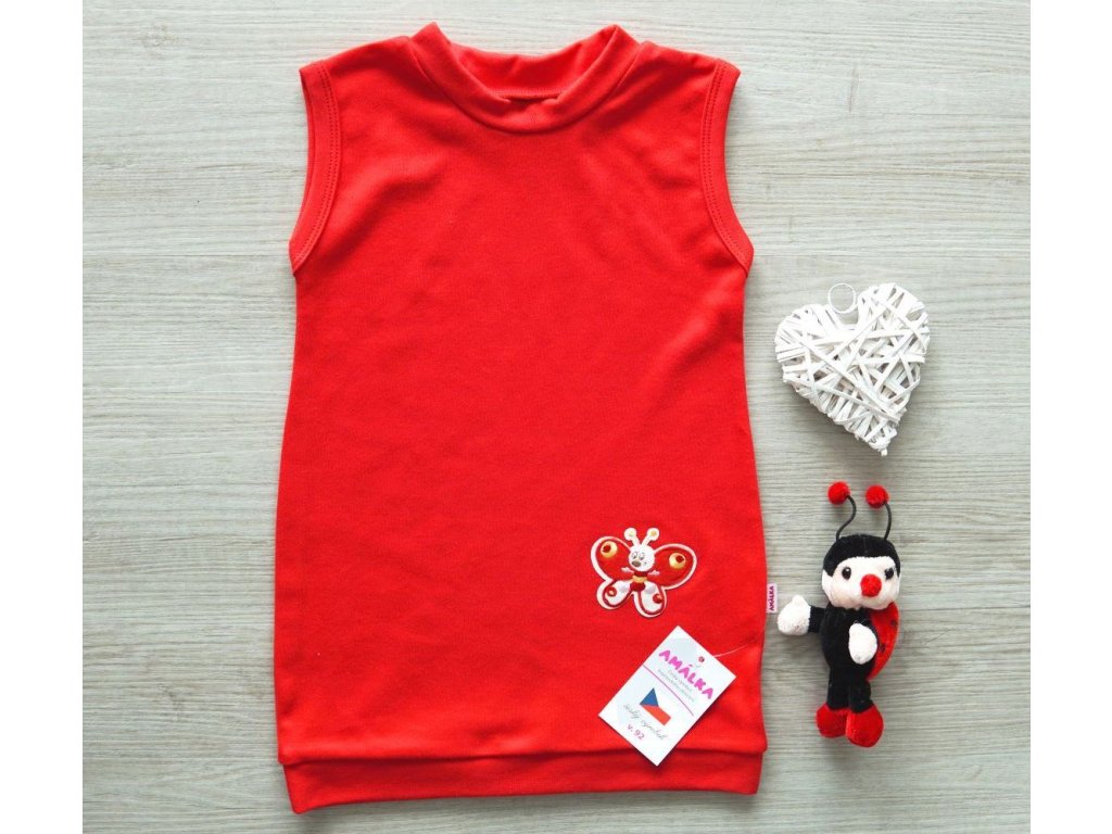 Kouzelné, volné šatičky balonového střihu bez rukávku. Červená barva s vyšitou aplikací motýlka. Stříháno ručně. Dekorace není součástí výrobku....