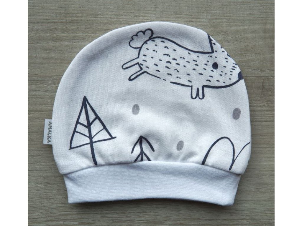 Jednovrstvá kojenecká čepička v potisku s králíčkem v lese.