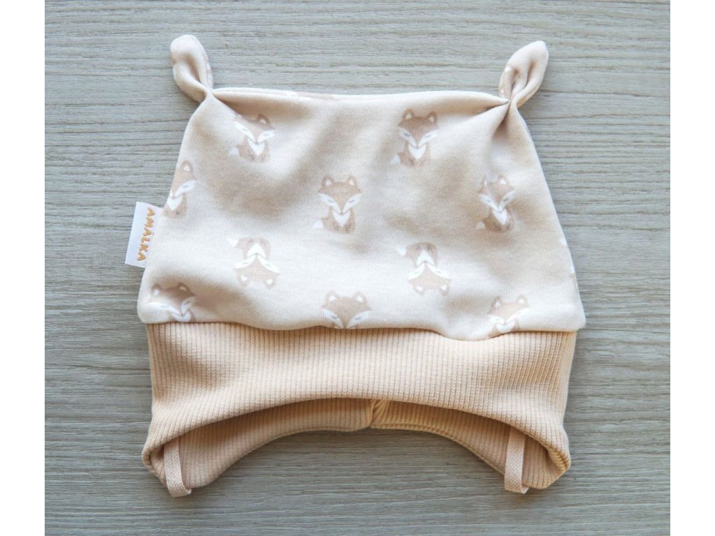 Kvalitní, zavazovací čepička s ozdobnými oušky. Velmi slušivá na hlavičce. Kouzelný potisk malé, roztomilé lišky v oříškové barvě.