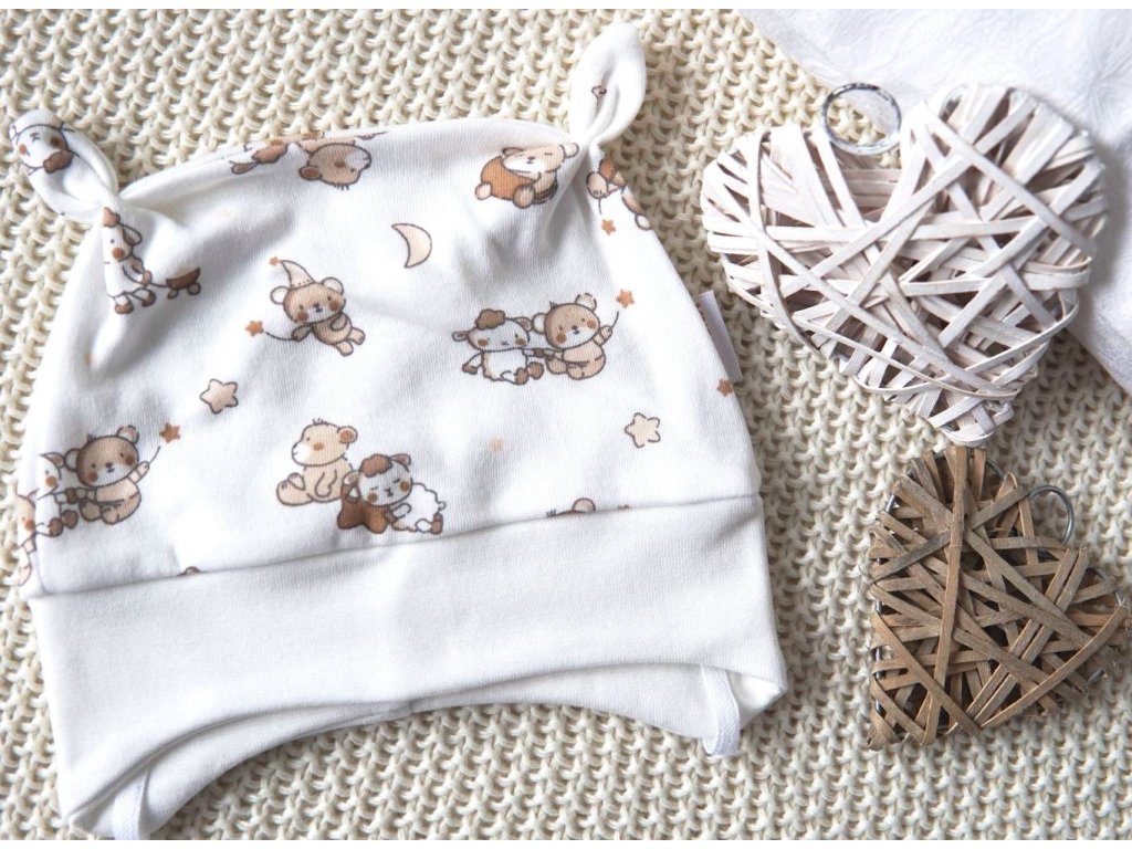 Kvalitní zavazovací čepička s ozdobnými oušky. Velmi slušivá na hlavičce. Kouzelný potisk malých medvídků v oříškové a smetanové barvě.