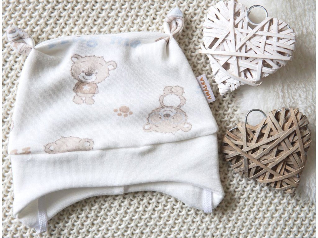 Zavazovací čepička s ozdobnými oušky. Velmi slušivá na hlavičce. Něžný potisk s medvídkem v oříškové a smetanové barvě.