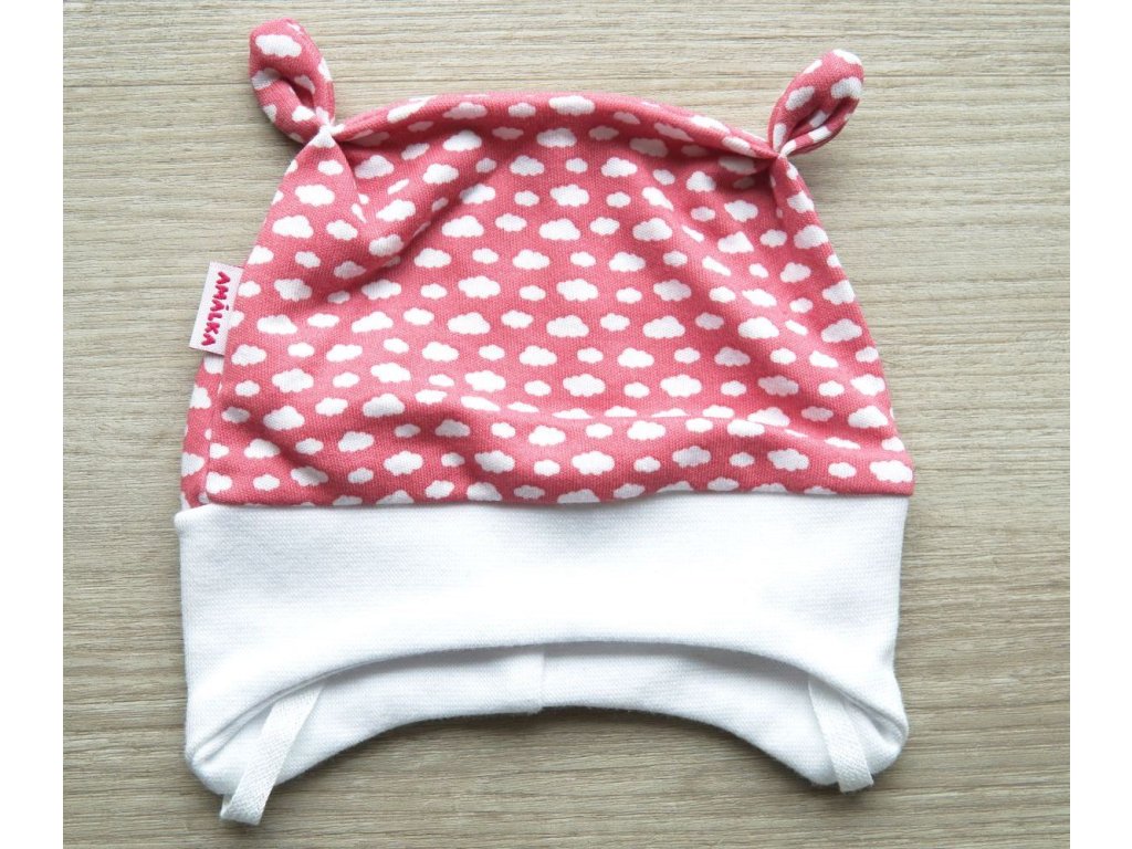 Zavazovací čepička s ozdobnými oušky. Velmi slušivá na hlavičce. Pěkný potisk v korálové barvě s obláčky.