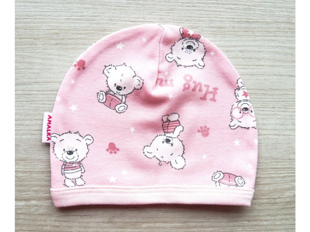 Klasická bavlněná jednovrstvá, nasazovací čepička saporka. Slušivá na hlavičce. Kouzelný potisk s medvídky v pudrově růžové barvě.