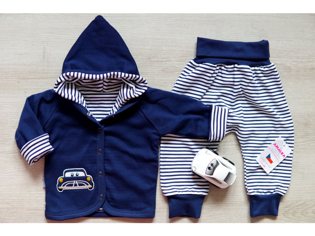 Bavlněná kojenecká souprava tmavě modrá s pruhy, autíčko
