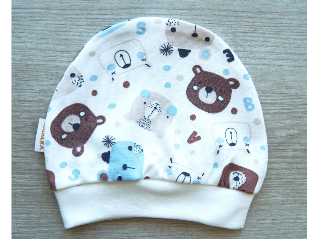 Jednovrstvá, bavlněná čepička v kouzelném potisku s medvídky v neutrálních barvičkách.