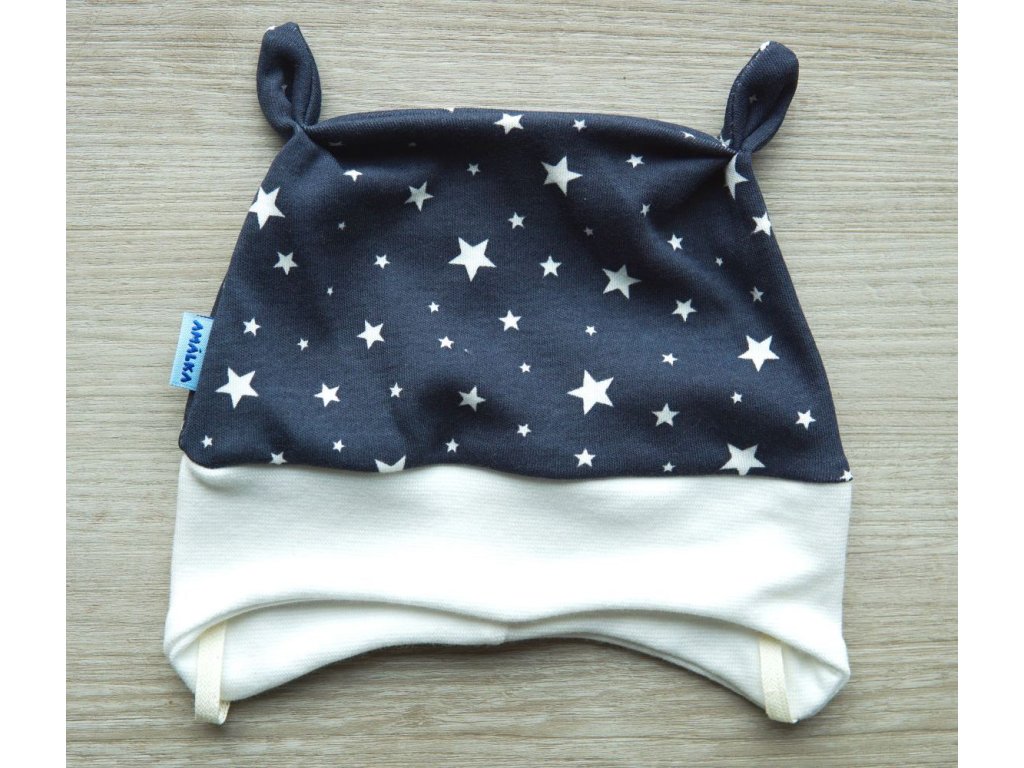 Kvalitní zavazovací čepička s ozdobnými oušky. Kouzelný potisk Hvězdiček v barvičkách modrošedé a smetanové. Velmi slušivá na hlavičce....