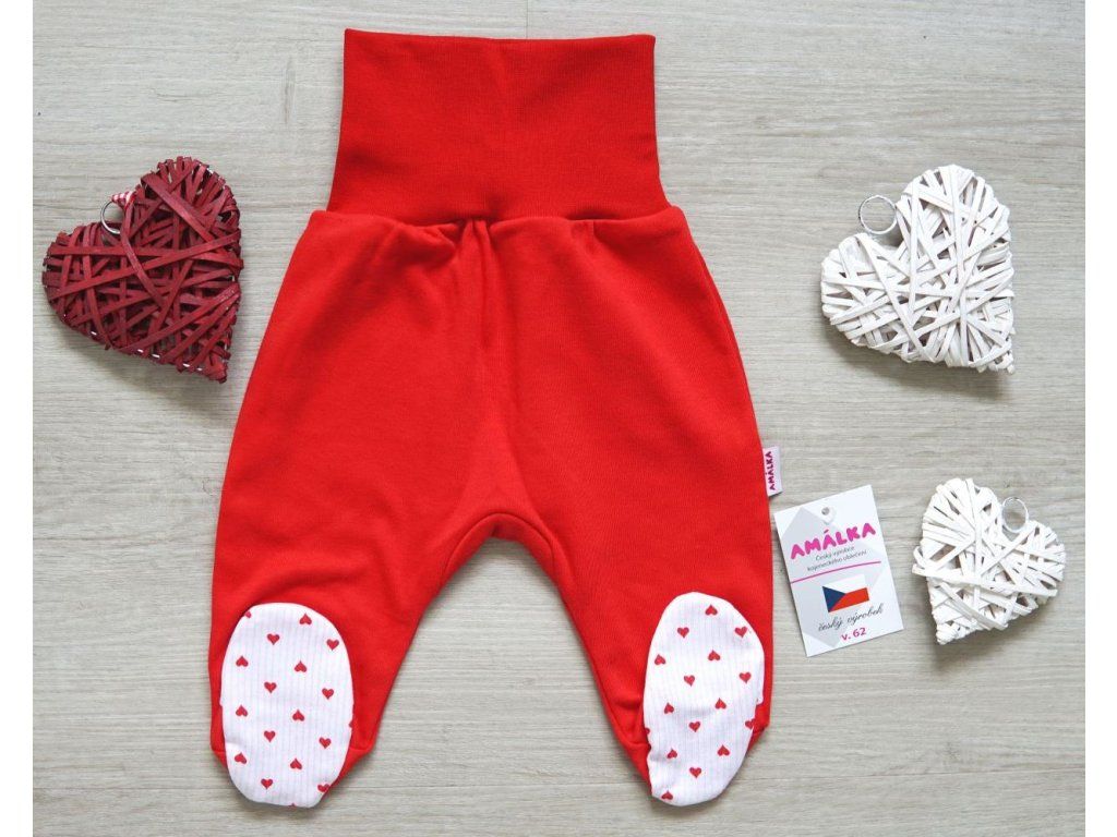 Kojenecké polodupačky z příjemného, bavlněného materiálu. Červená barva v kombinaci s ťapkami v potisku srdíček.