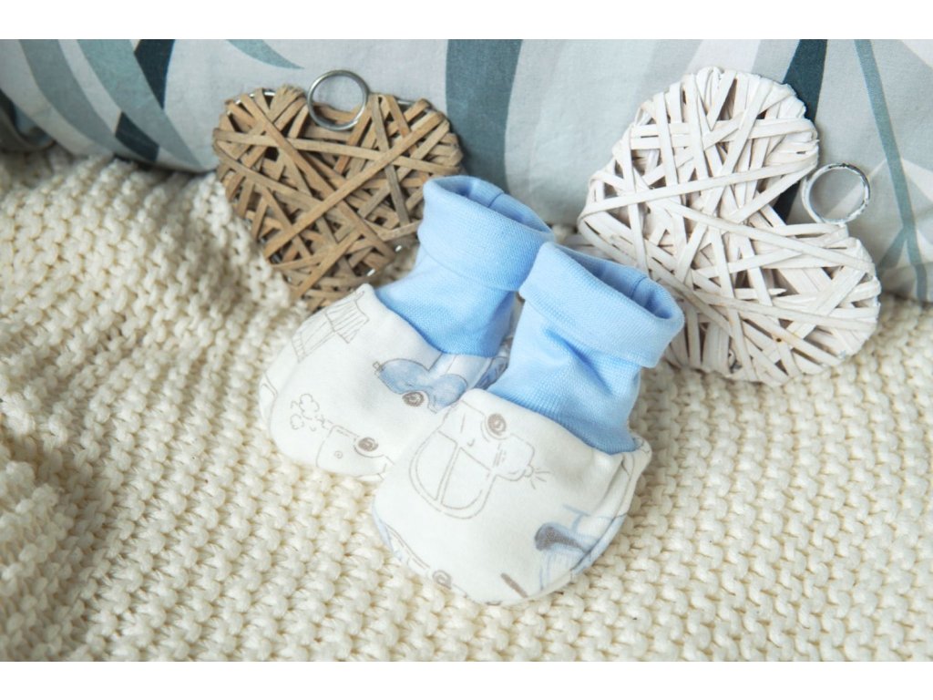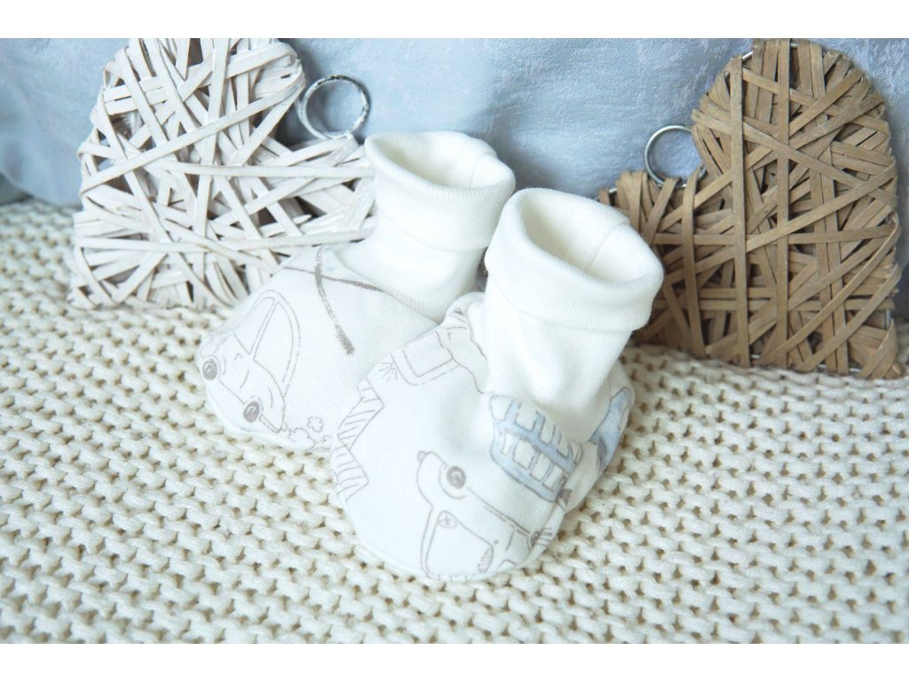 Kojenecké capáčky z jemného, bavlněného materiálu v kouzelném potisku s auty.