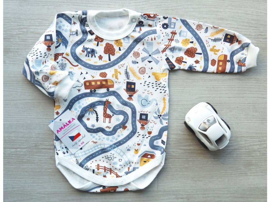 Kvalitní bavlněné body s dlouhým rukávem. Kouzelný potisk s cestičkami. Propínání u krku a v rozkroku na dva baby patenty od německého výrobce....