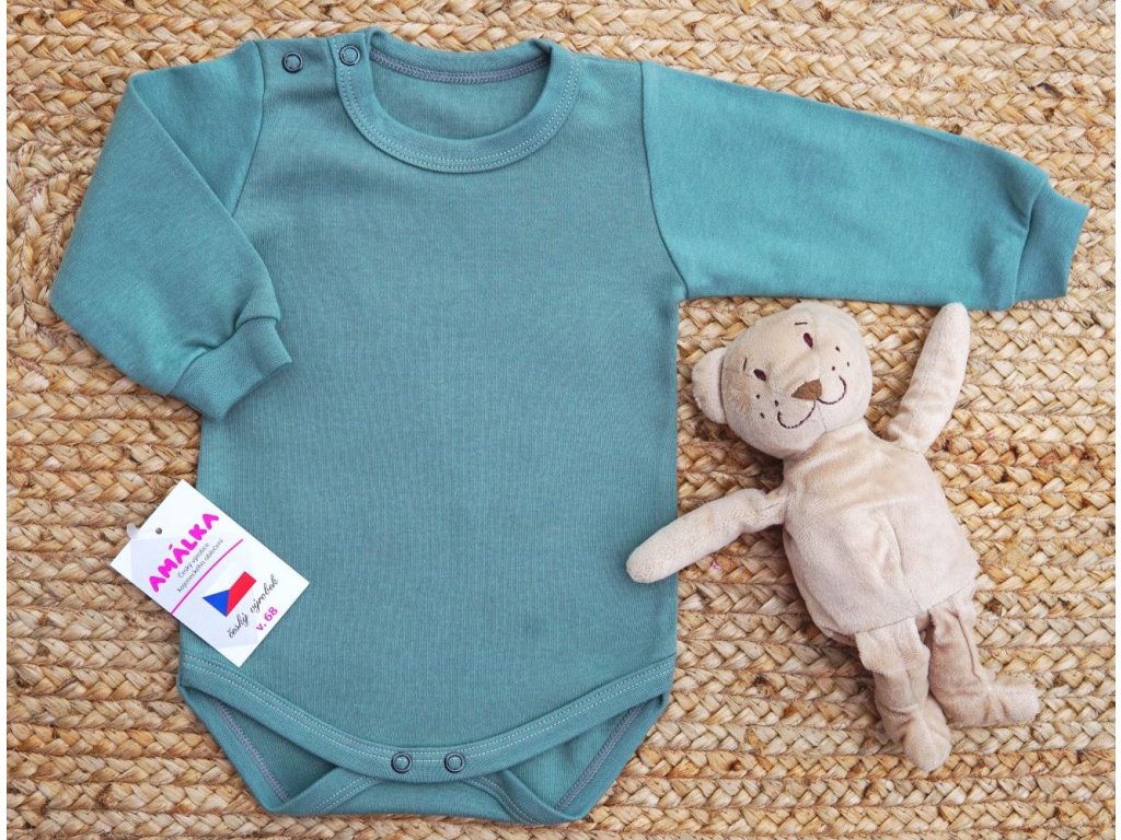 Kvalitní bavlněné body s dlouhým rukávem v kaktusově zelené barvě. Propínání u krku a v rozkroku na dva baby patenty.