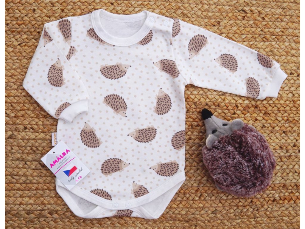 Kvalitní, bavlněné body s dlouhým rukávem. Roztomilý potisk Ježka v kombinaci barviček latté a smetanové.