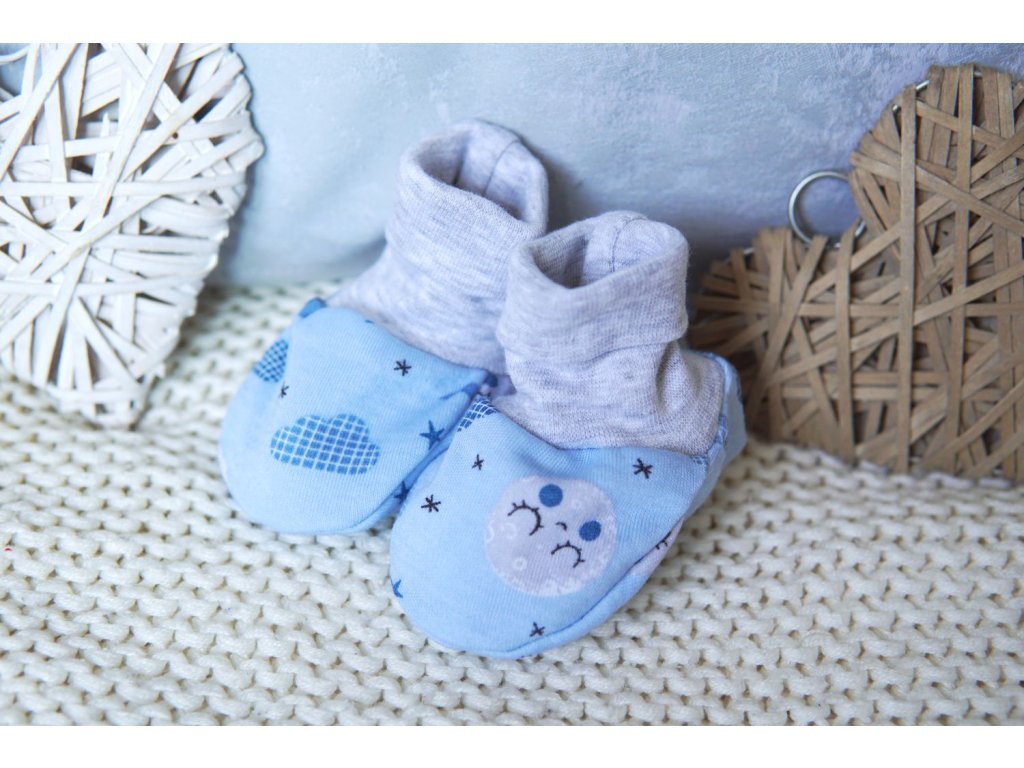 Kojenecké capáčky z jemného, bavlněného materiálu v modrošedém potisku.