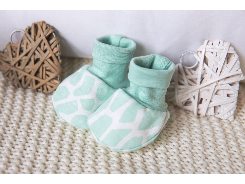 Kojenecké capáčky z jemného, bavlněného materiálu v žirafím potisku v zelené a smetanové barvě.