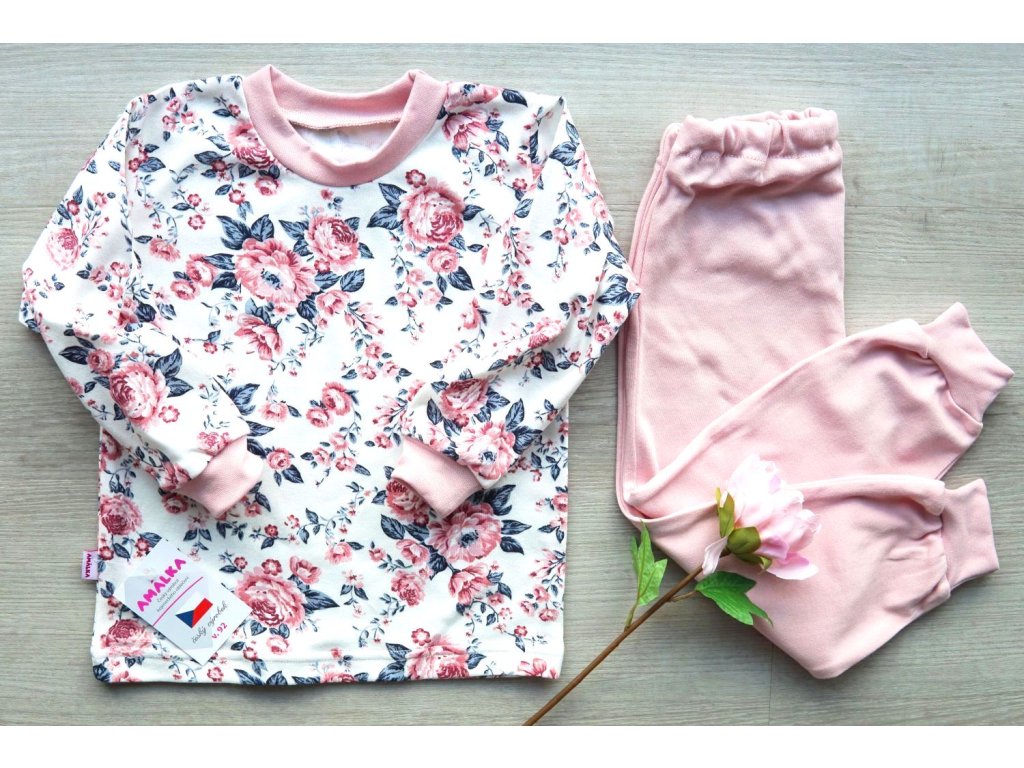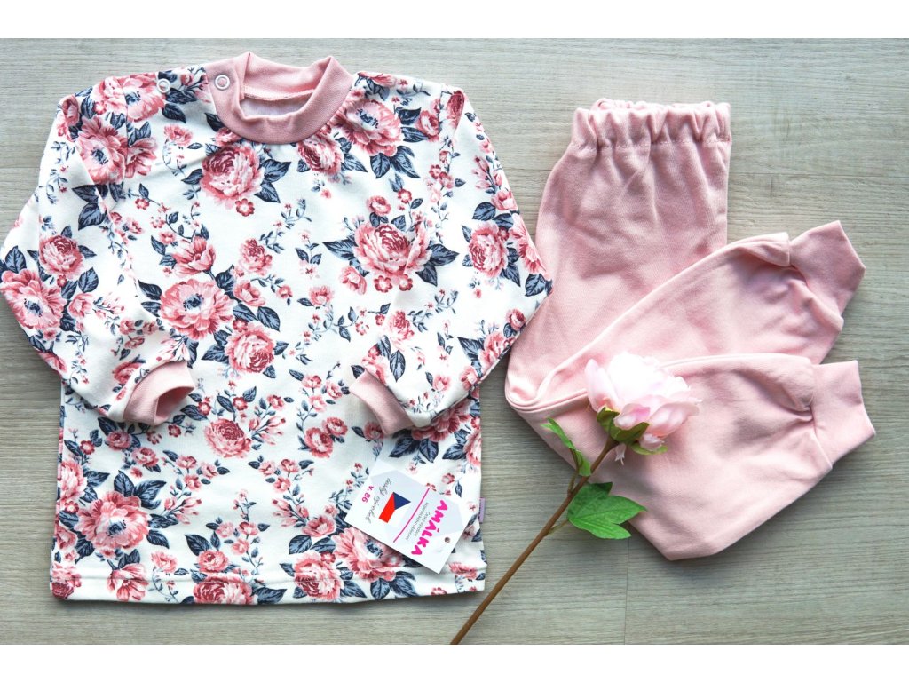 Kvalitní bavlněné dvoudílné pyžamo. Kouzelný potisk květů v barvičkách pudrově růžové a slonové kosti. Nápletky jsou ušity z elastického materiálu...