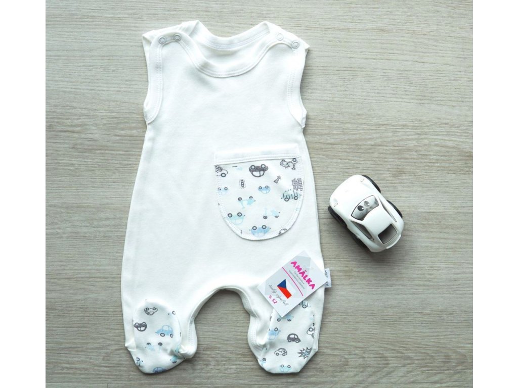 Bavlněné smetanové dupačky, kapsa s autíčky