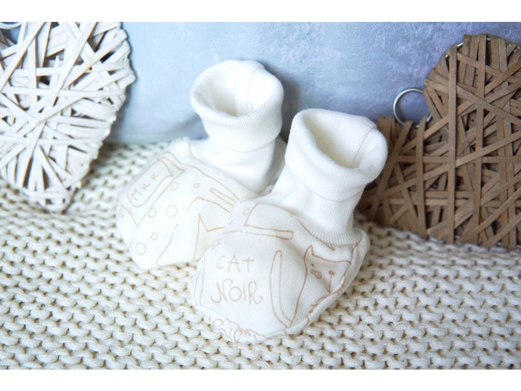 Kvalitní, kojenecké capáčky z jemného bavlněného materiálu. Kouzelný potisk s kočičkami v neutrální, smetanové barvičce . Elastický náplet...