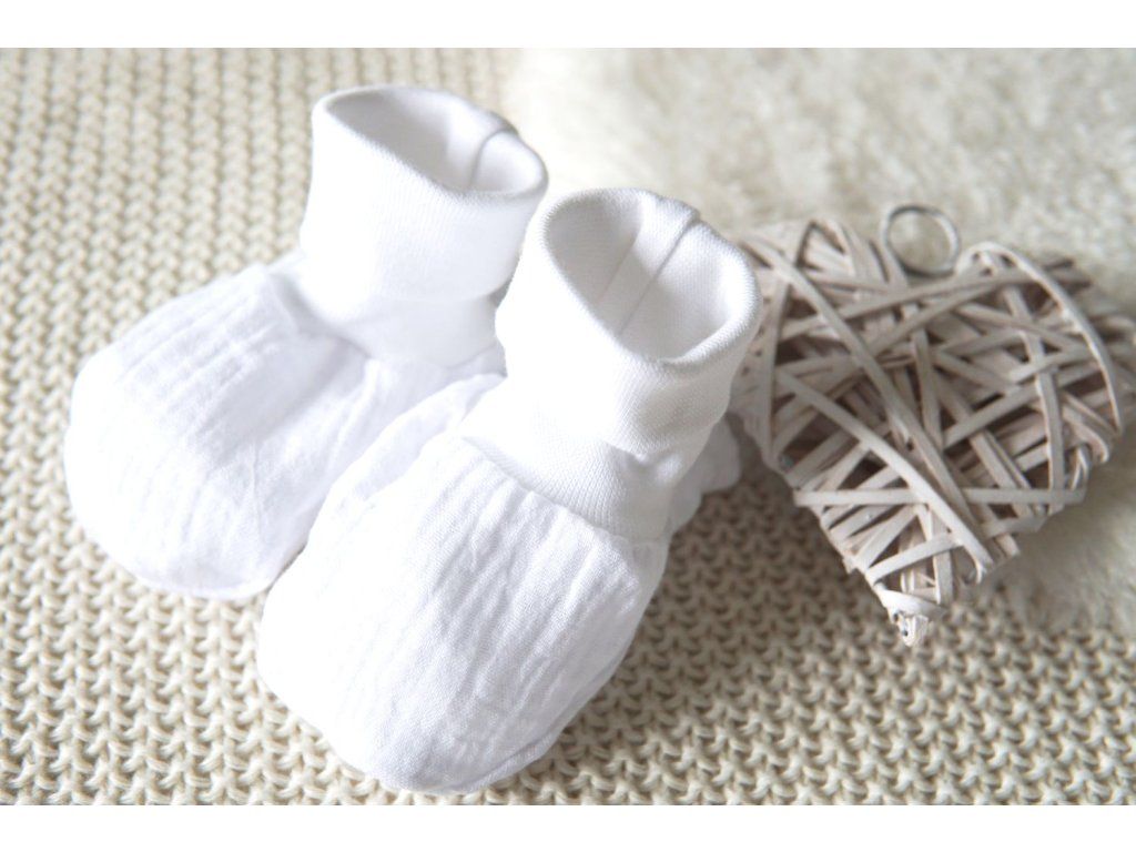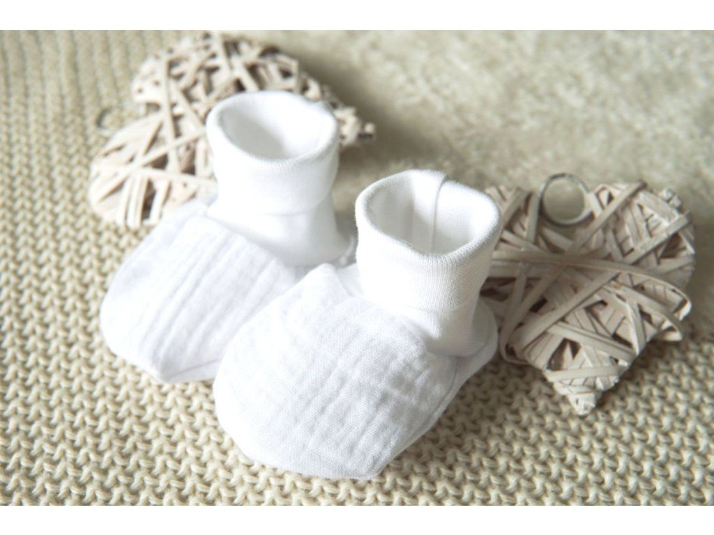 Kojenecké capáčky z jemného, prodyšného a vzdušného mušelínu - 100% bavlna v něžné bílé barvě.