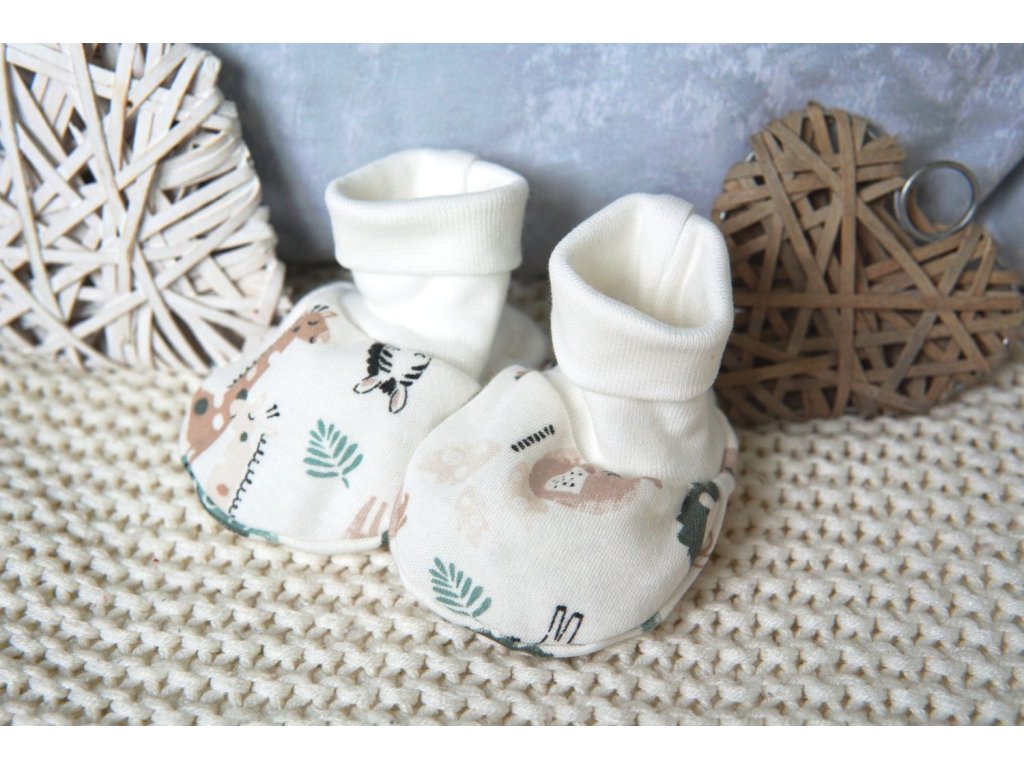 Kvalitní, kojenecké capáčky z jemného bavlněného materiálu. Pěkný potisk zvířátek safari. Elastický náplet pěkně drží a obepíná nožku miminka.