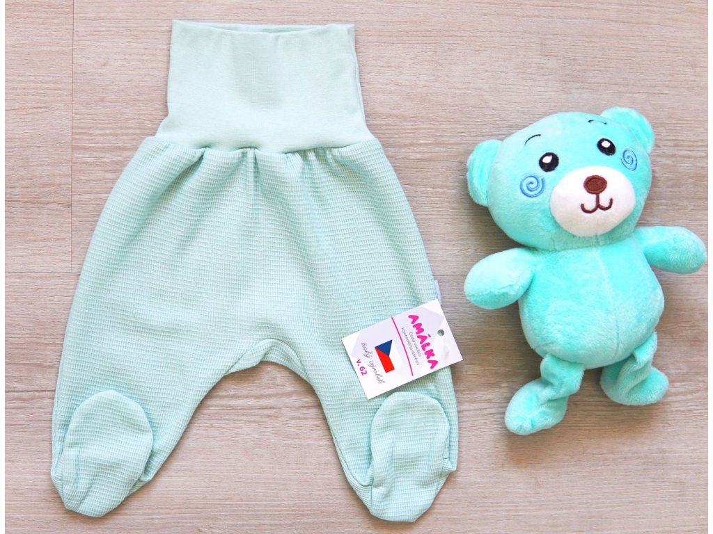 Polodupačky pro miminko z příjemného materiálu vafle, zelené mintové barvy. Bavlna není hrubá, tudíž ideální na nošení od jara do podzimu, či na doma celoročně.