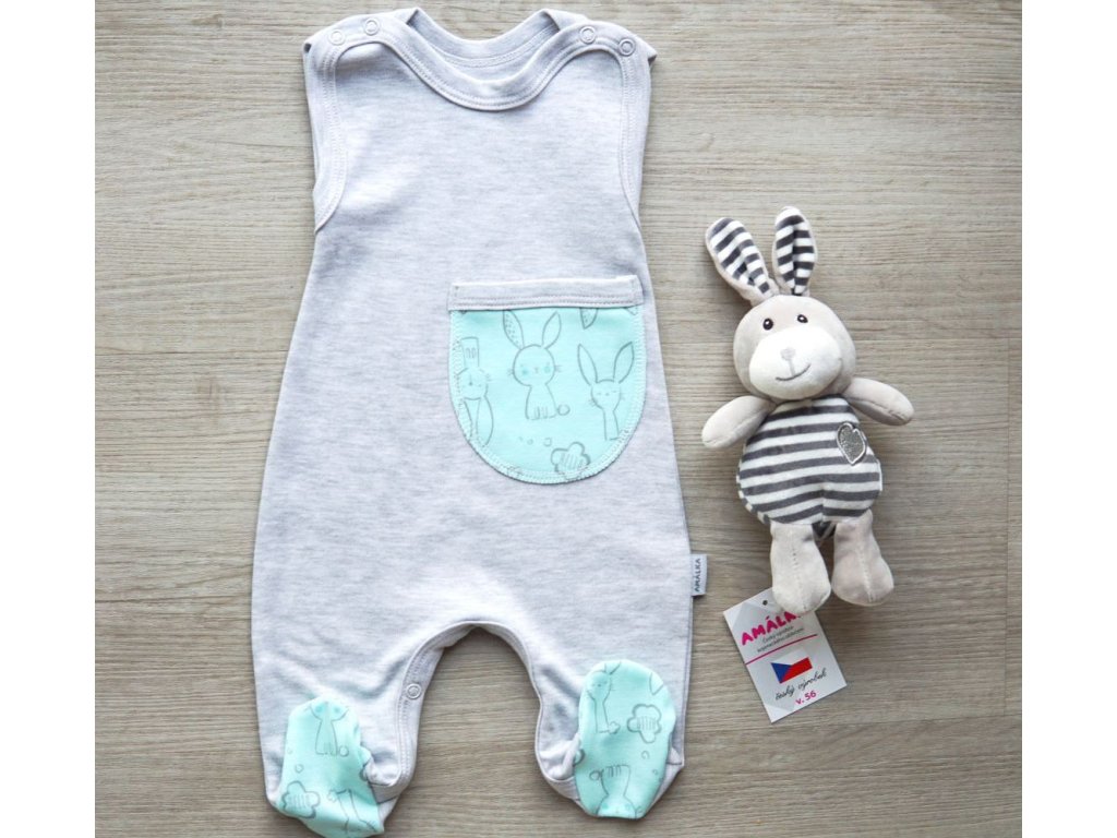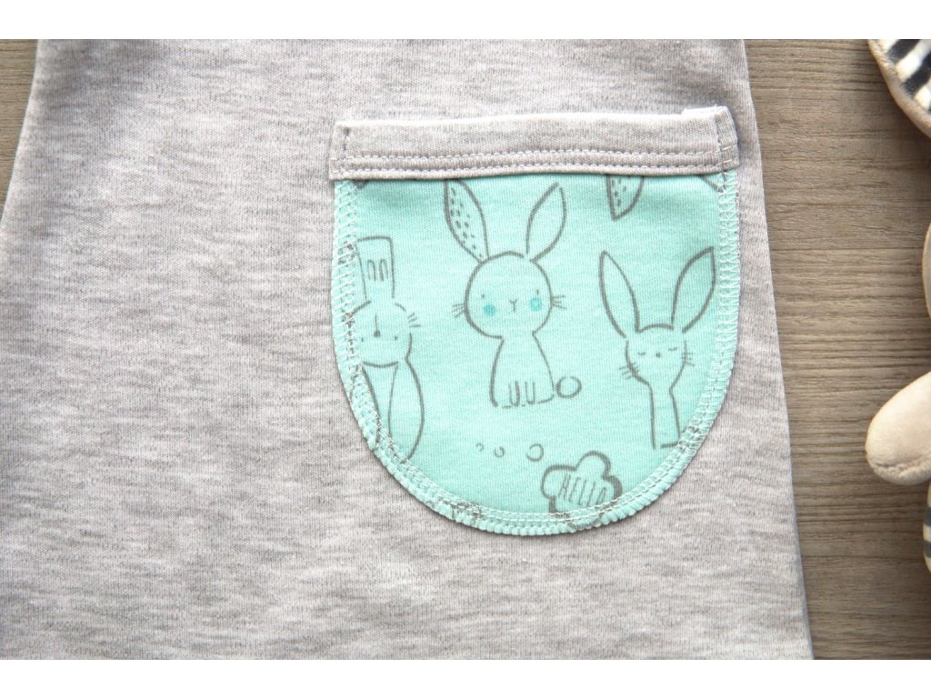Bavlněné dupačky s něžnou kapsou roztomilého zajíčka v šedé a zelené barvě.