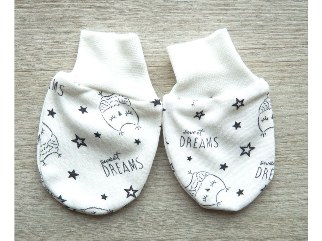 Bavlněné rukavičky bez palečku pro vaše miminko. Pěkný potisk soviček ve smetanové barvě. Jsou ukončeny do pružného nápletu 95% bavlna + 5% elastan.