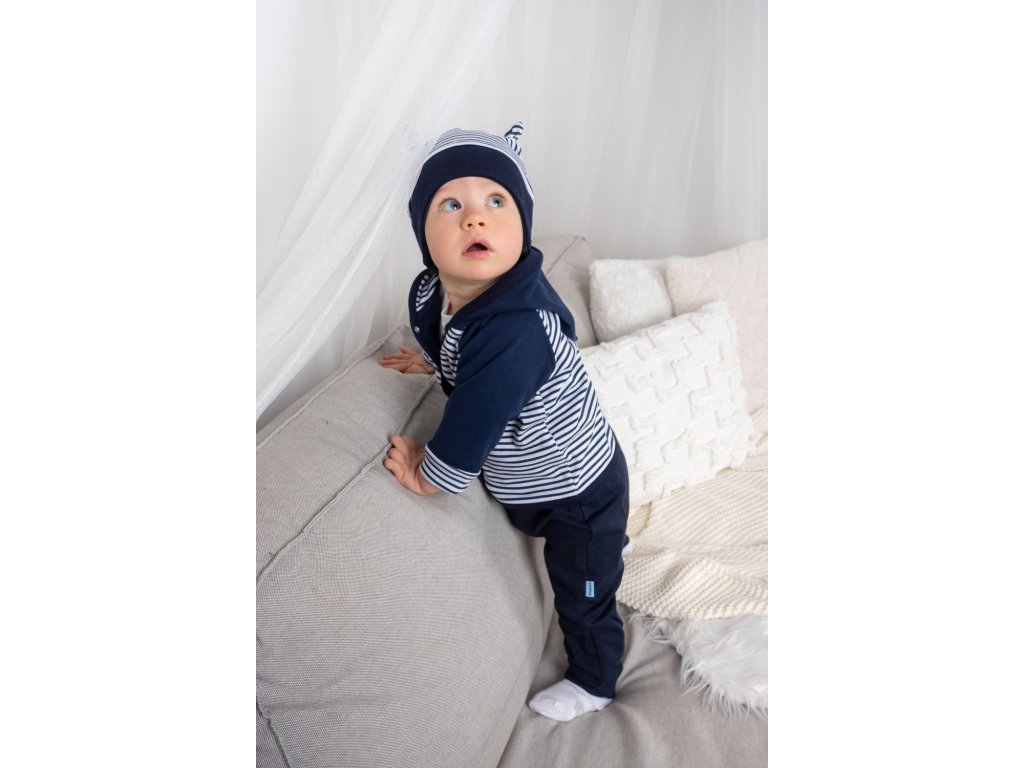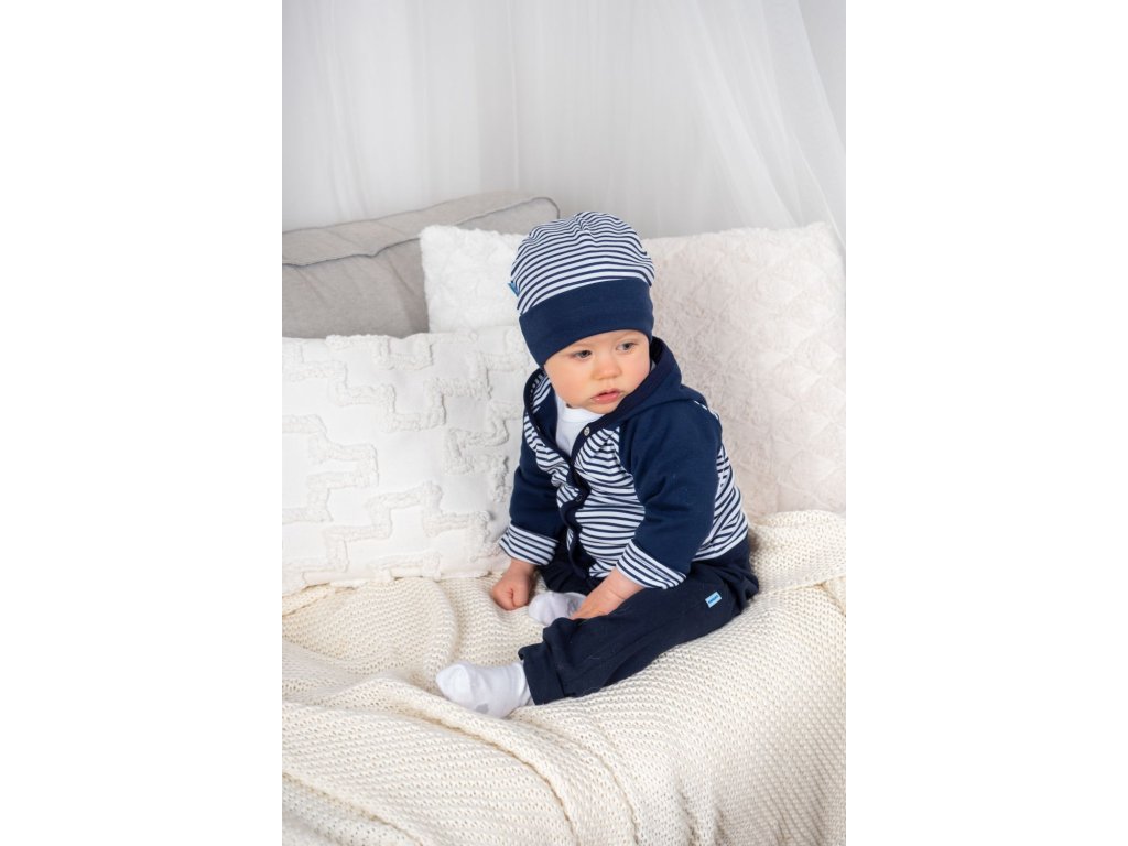 Kvalitní, celopodšitý, dvojitý bavlněný kabátek s kapucí pro Vaše miminko. Kouzelný potisk  pruhů v bílé a temně modré barvě v kombinaci s vyšitou...
