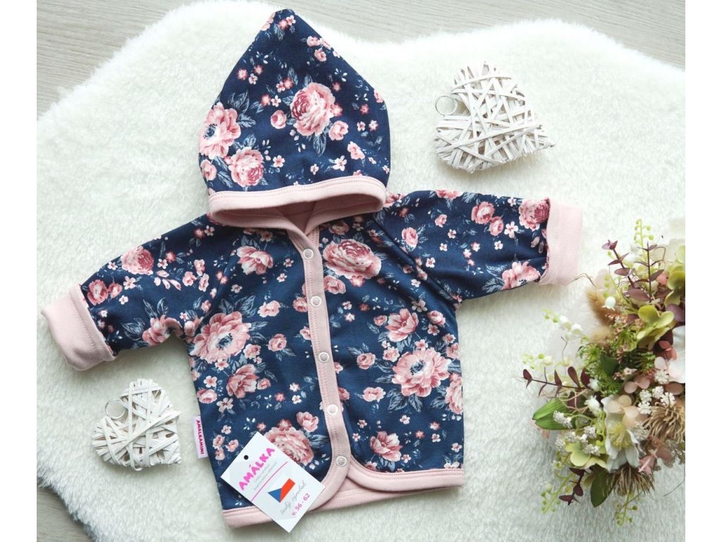 Kvalitní celopodšitý, dvojitý bavlněný kabátek s kapucí pro Vaši malou holčičku. Romantický potisk pudrově růžových květů v tmavě modré barvičce.