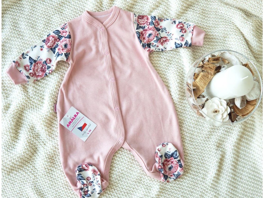 2.jakost - vada v látce z výroby, malá dírka u nýtku. Dívčí overal nejen na spinkání, ale také pro běžné denní nošení. Něžný potisk květů na rukávcích a ťapkách v pudrově růžové barvě.