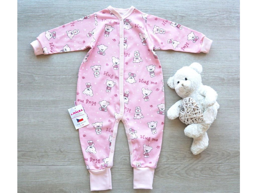Kvalitní overal nejen na spinkání, ale také pro běžné denní nošení. Něžný potisk růžových medvídků. Celorozepínací až k nožkám na baby..