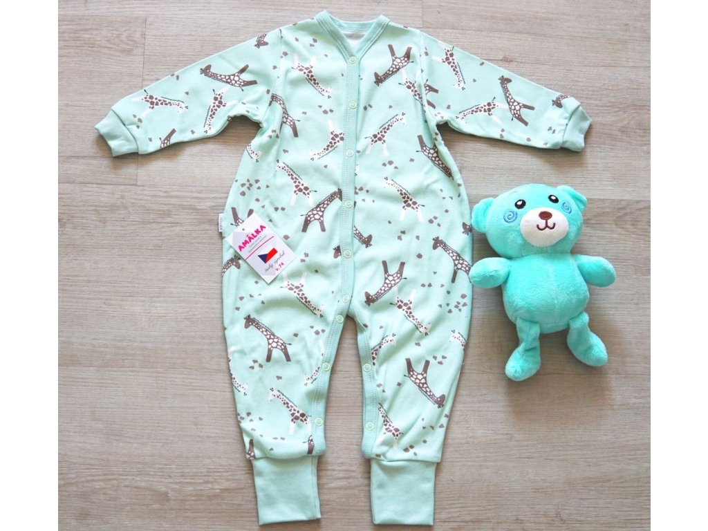 Bavlněný overal nejen na spinkání, ale také pro běžné denní nošení. Úžasný potisk žirafek v zelené mint barvě.