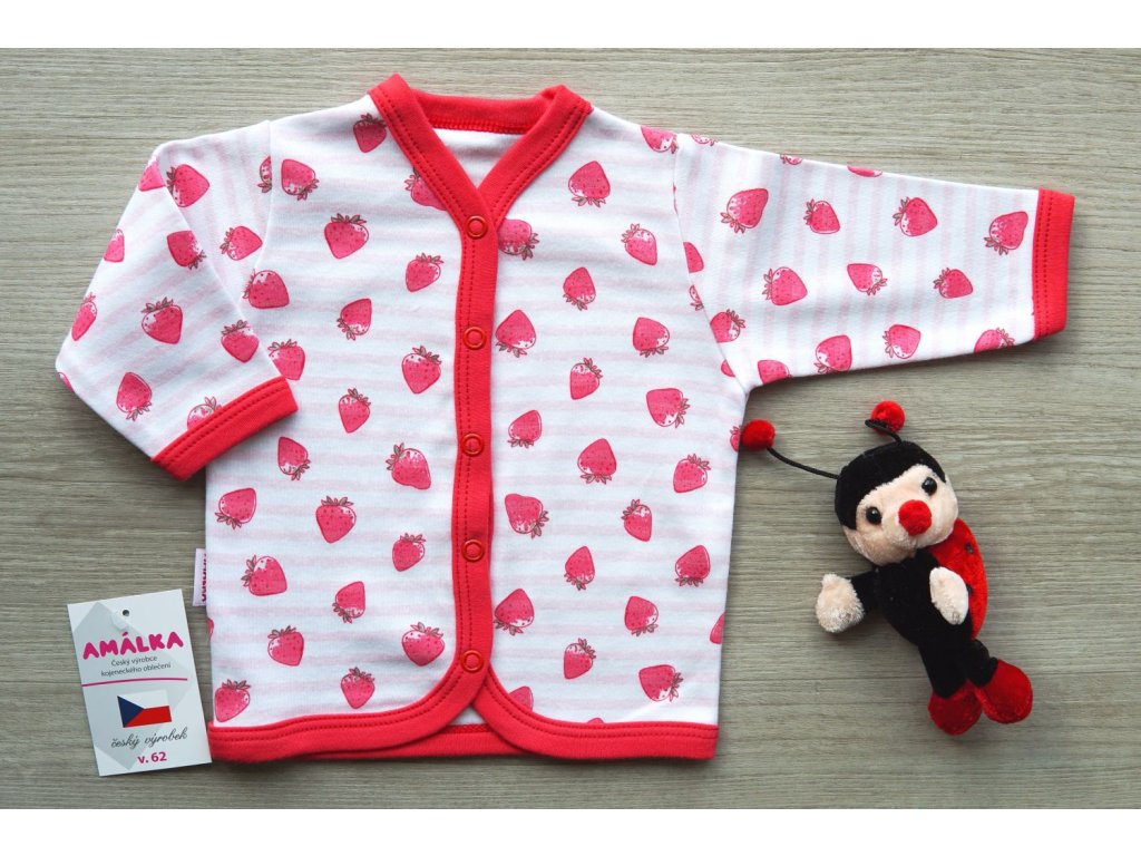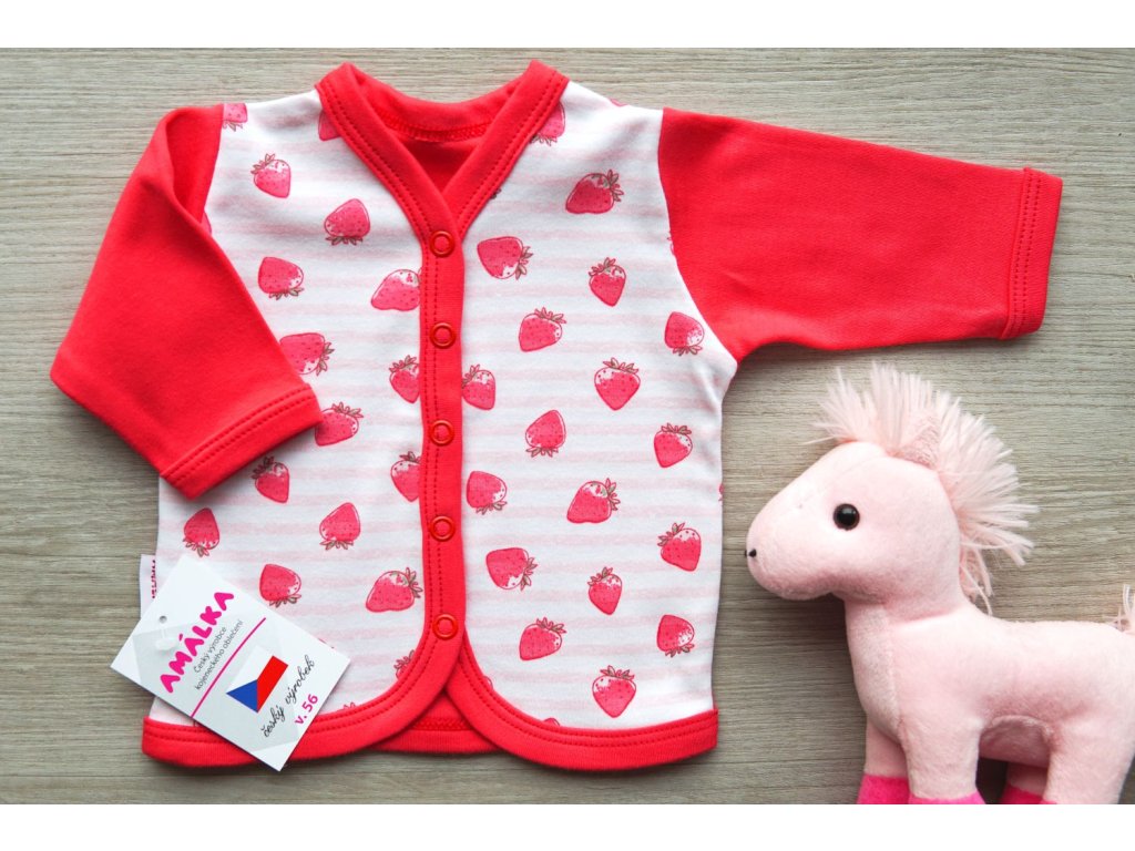 Kvalitní, kojenecký kabátek neboli tenčí mikina z příjemné, měkké bavlny. Něžný potisk s jahůdkami.