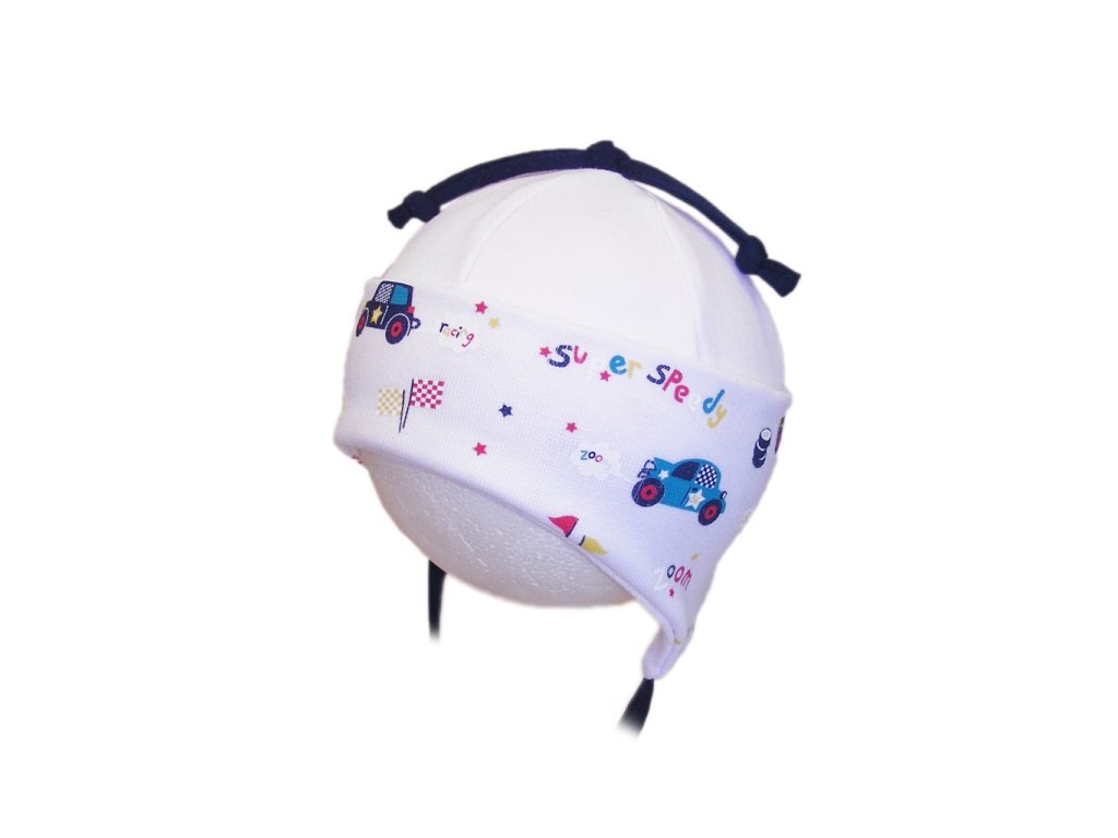 Je zdobena potiskem autíček a přes čelo a ouška je celkem třívrstvá.