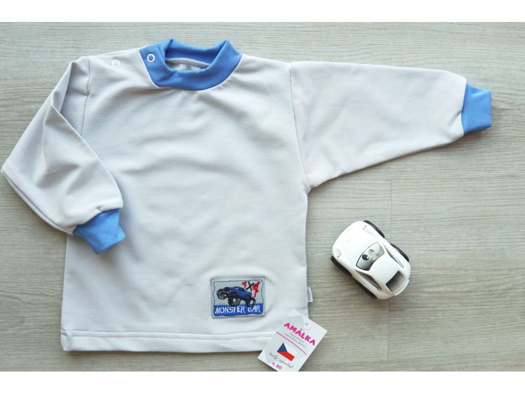Kvalitní dětská mikina v šedé a modré barvičce s našitou aplikací auta.