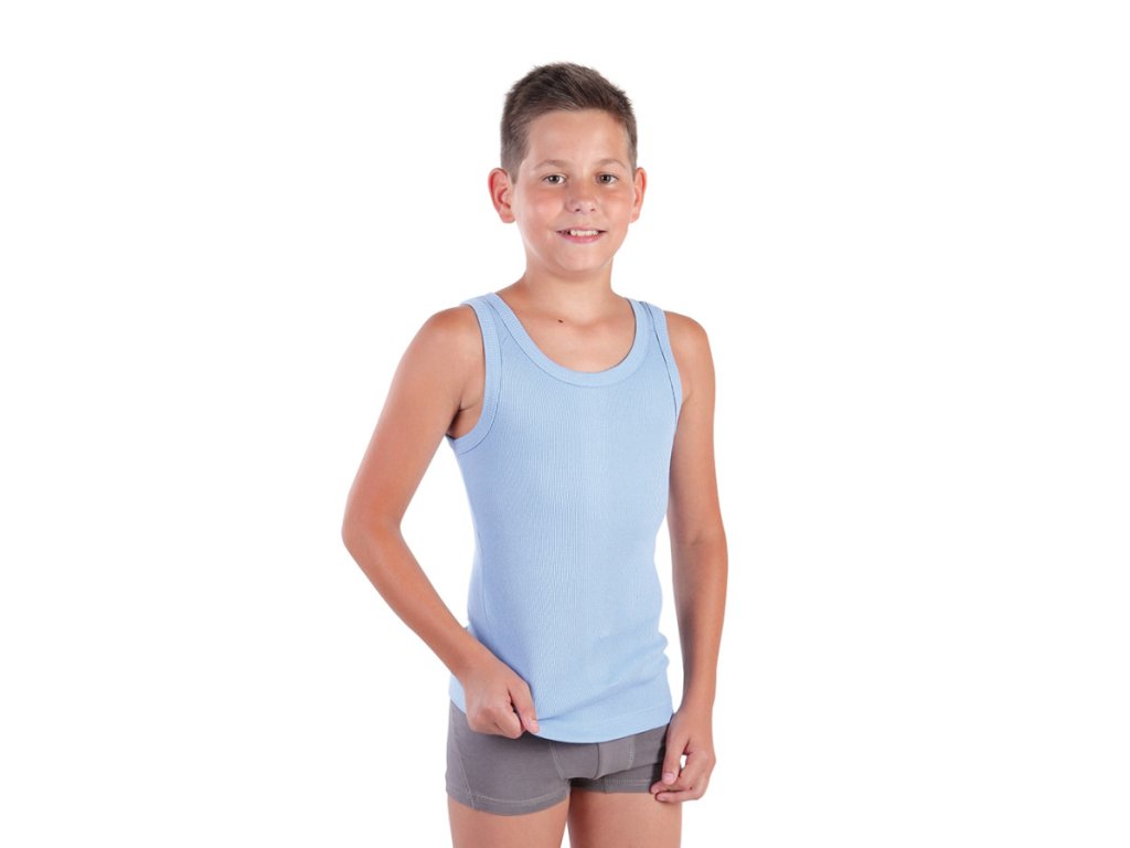 Chlapecký bavlněný nátělník bez rukávů v modré barvě. Vaše děti ho ocení v zimě jako hřejivé spodní prádlo a v létě jako tričko bez rukávů.