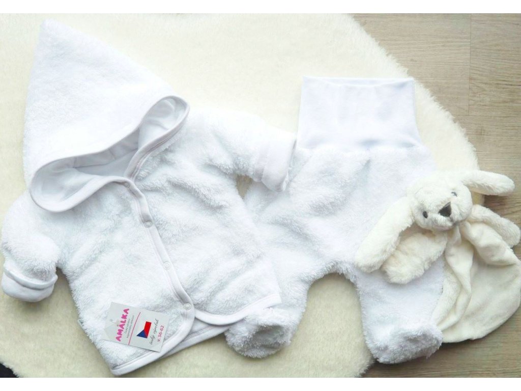 Kompletek se skládá z kabátku s kapucí, který je ještě celopodšitý bavlnou + chlupaté polodupačky.