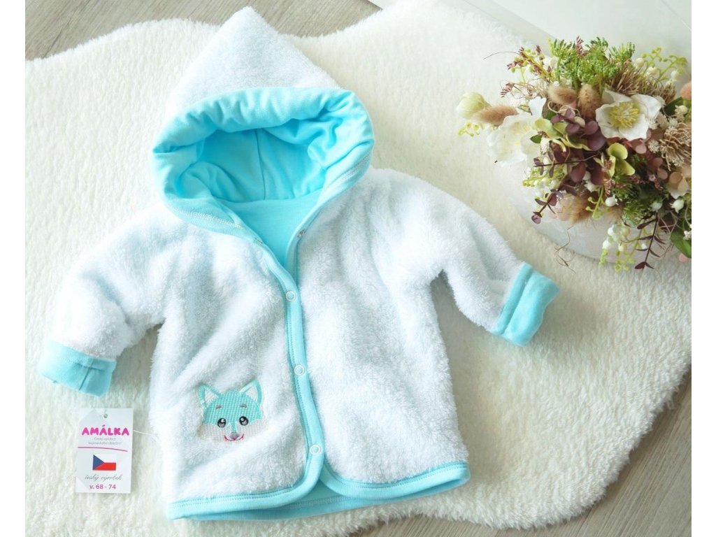 Chlupatý, bílý, podšitý kabátek, tyrkys