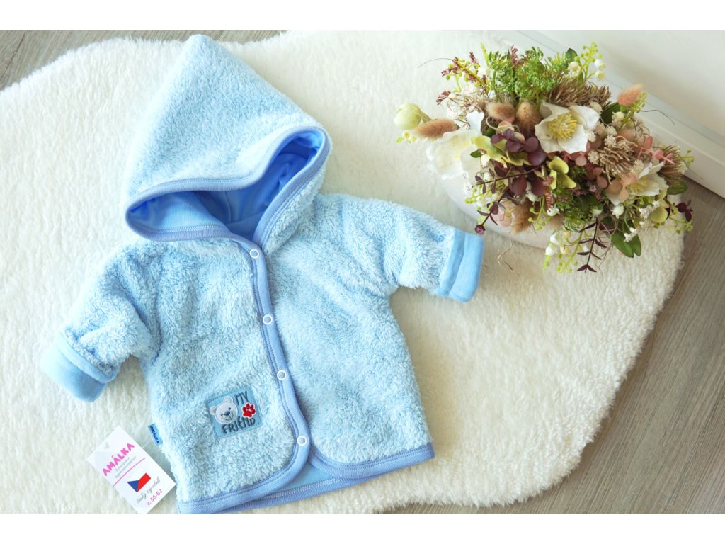 Kvalitní teplejší kabátek s ohrnovacími rukávy. Kabátek má bavlněnou podšívku v modré barvičce. Roztomilý vyšitý obrázek. Mohou být různé....