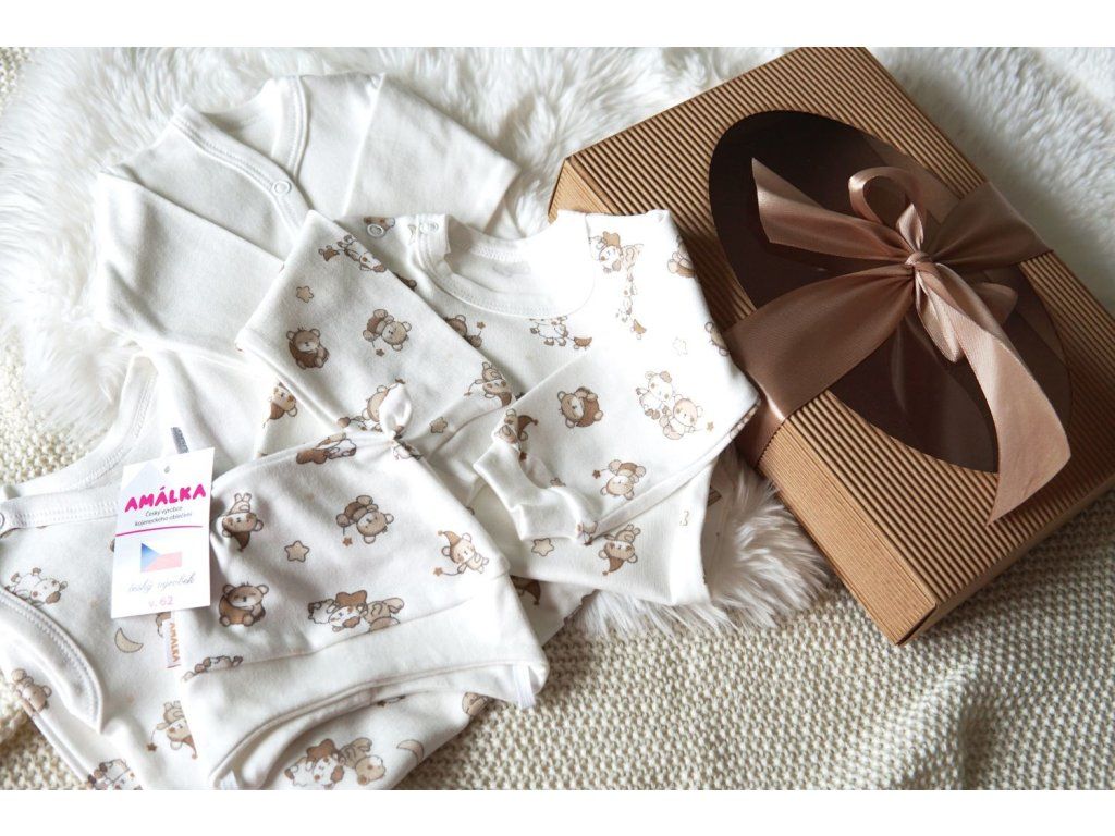Dárkové balení pro miminko v krabičce s oříškovou pentlí. Krásná 4-dílná bavlněná souprava pro miminko obsahuje oblečky v jemných neutrálních barvách oříškové a smetanové.