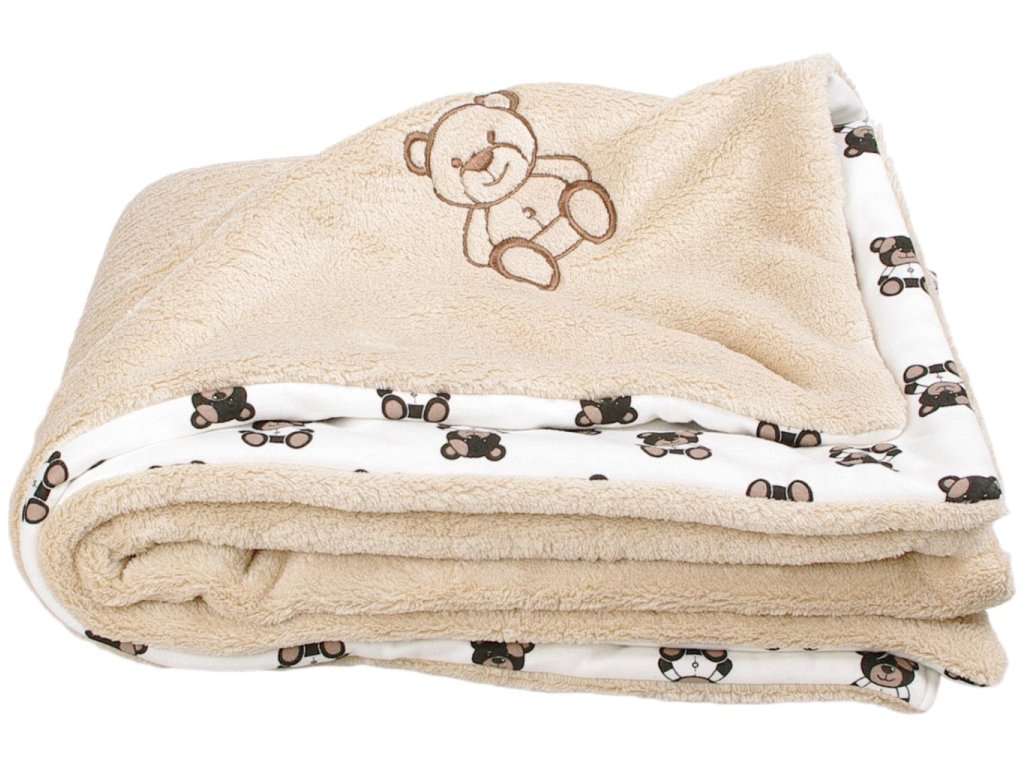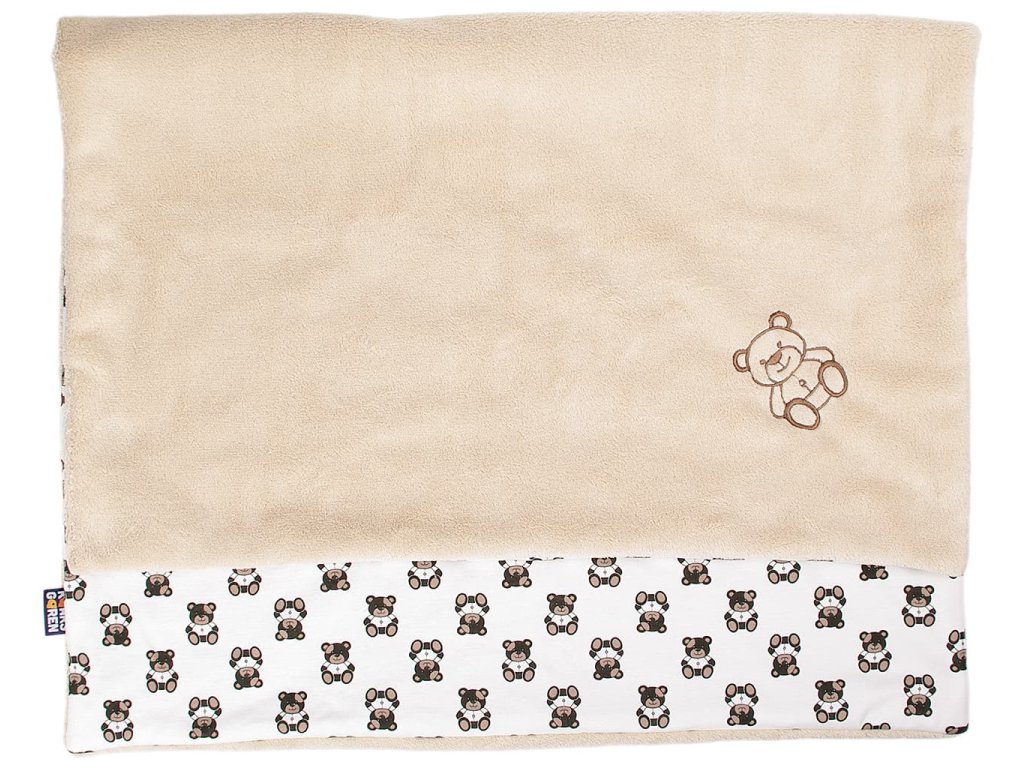Dětská oboustranná deka z dvou vrstev materiálu Wellsoftu a bavlny. Vrchní strana je z oříškového Wellsoftu (100% polyester) s výšivkou medvídka a spodní strana je ze 100% bavlny s potiskem medvídků.