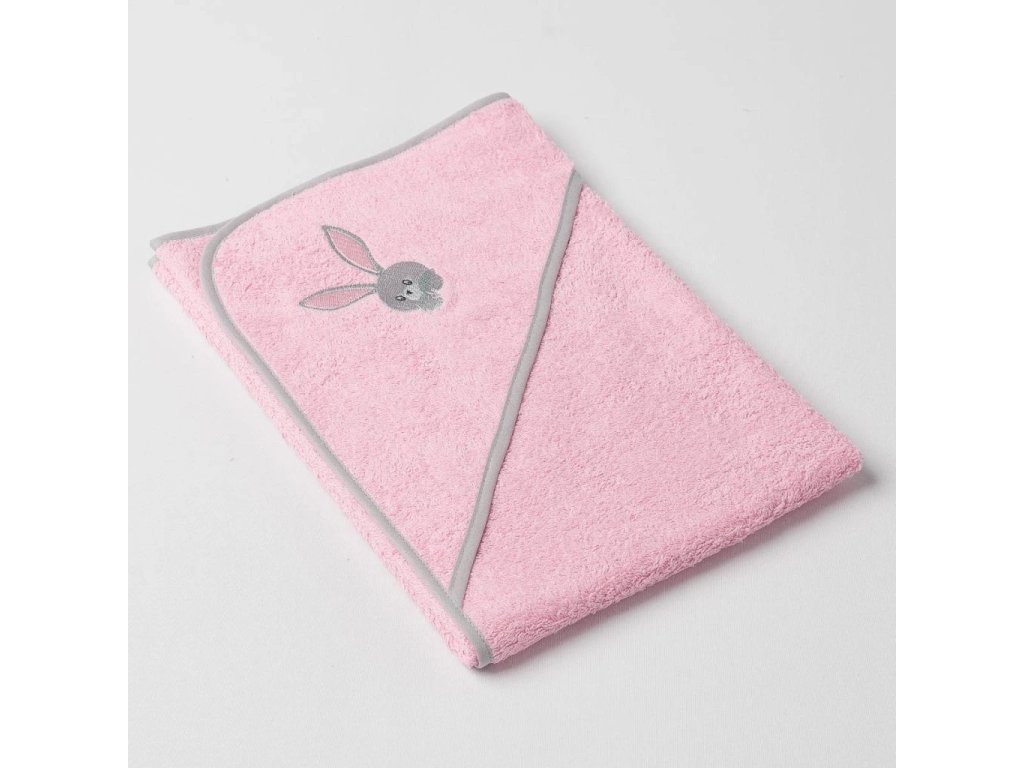 Dětská osuška Veba s kapucí růžová s výšivkou Zvědavý zajíček šedá lemovka