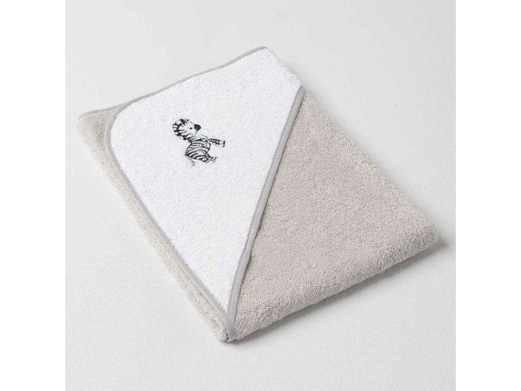 Dětská osuška Veba s kapucí světlo šedobílá s výšivkou Zebra šedá lemovka