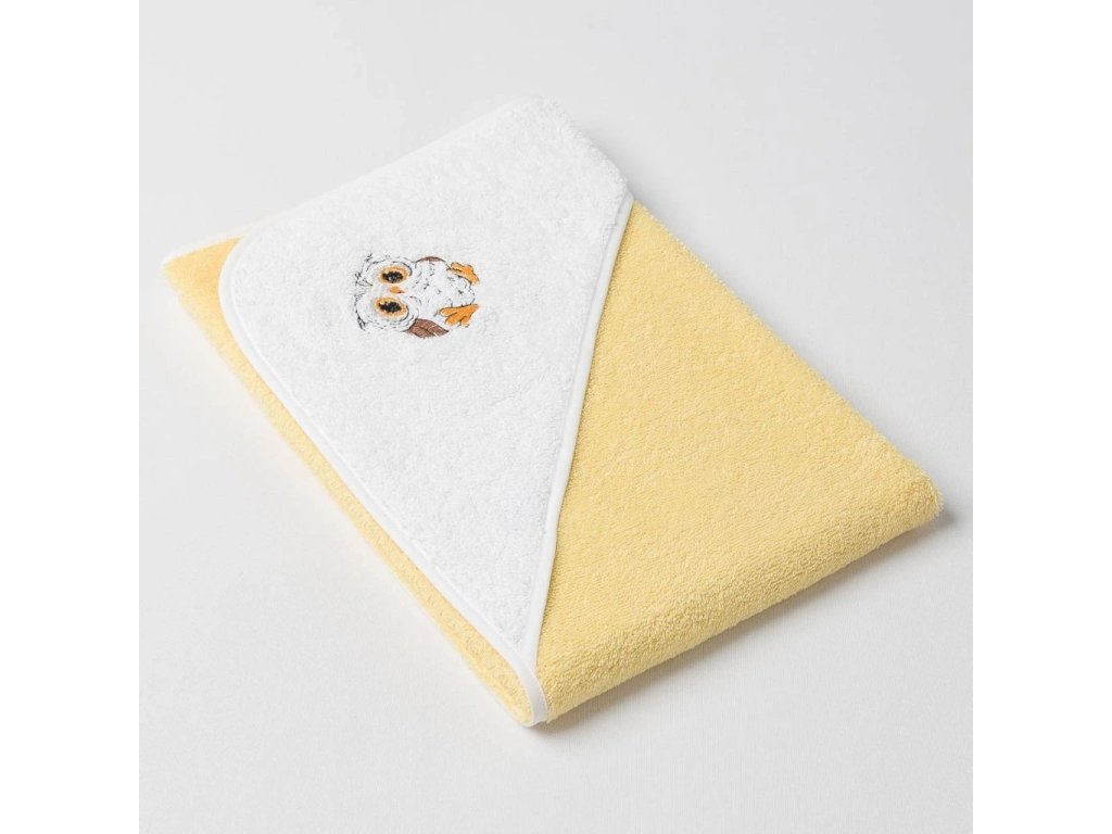 Dětská osuška Veba s kapucí žluto/bílá s výšivkou Moudrá sovička bílá lemovka