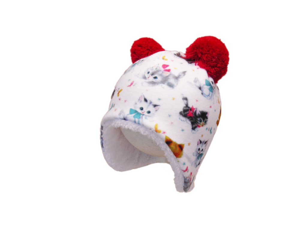 Dětská čepice zimní bez šňůrek. Zdobená potiskem koťátek a dvěma bambulkami.