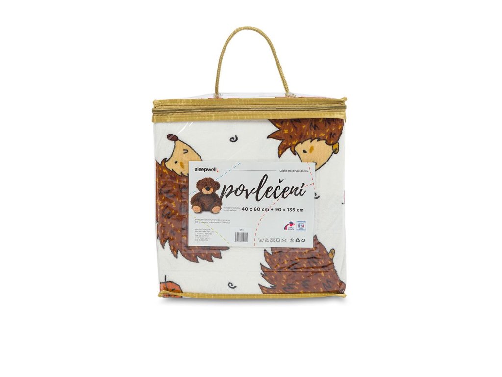 Dětské povlečení z hebkého mikroflanelu sleep well s motivem ježků, balené v dárkové PVC tašce.