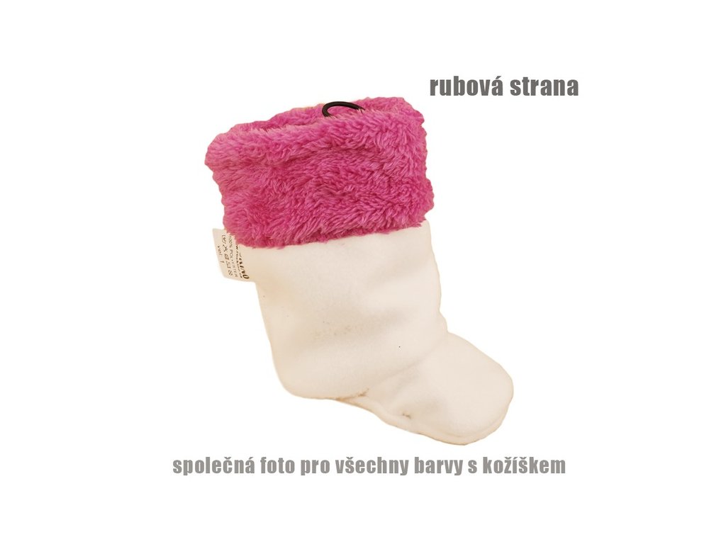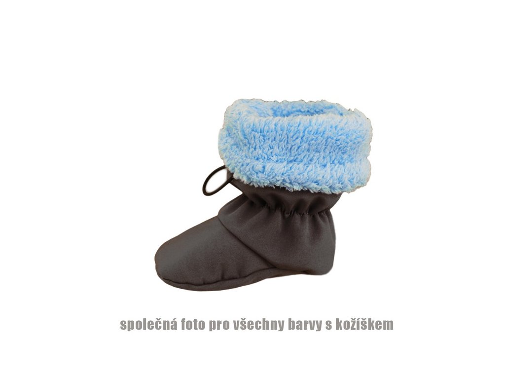 Pohodlné dvouvrstvé botičky do kočárku. Vhodné od podzimu do jara jako velmi dobré zateplení studených nožiček. Vrchní vrstva softshelI v prodyšné verzi 5000/5000, vnitřní vrstva příjemný polar-fleece, vrchní díl podšívky kožešinka Luna. Ideální jako první botičky pro miminka od narození až do věku cca 15 měsíců.