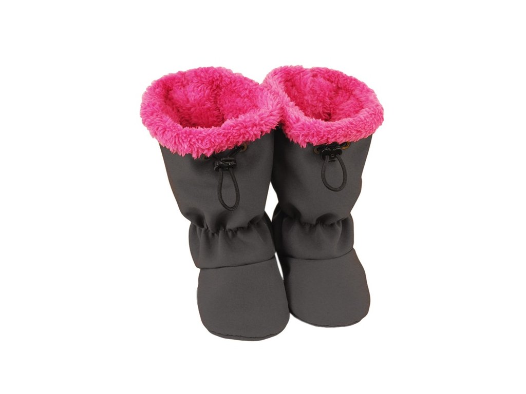 Pohodlné dvouvrstvé botičky do kočárku. Vhodné od podzimu do jara jako velmi dobré zateplení studených nožiček. Vrchní vrstva softshelI v prodyšné verzi 5000/5000, vnitřní vrstva příjemný polar-fleece, vrchní díl podšívky kožešinka Luna. Ideální jako první botičky pro miminka od narození až do věku cca 15 měsíců.