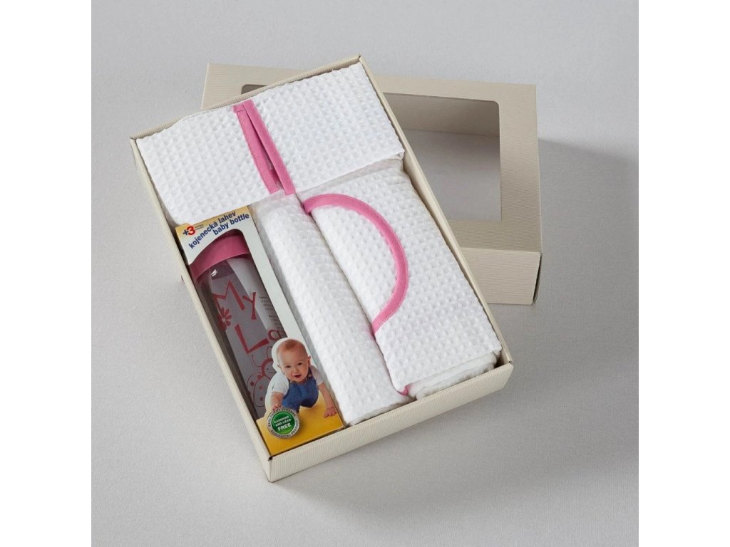 Dětský set Veba v dárkové krabici bílá s růžovou lemovkou a kojeneckou lahví