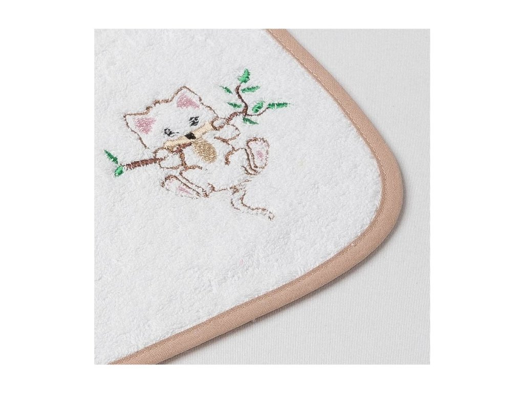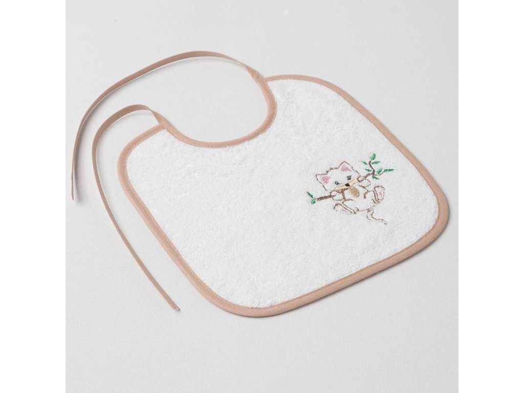 Dětský slintáček Veba bílá s výšivkou Kočička na větvi béžová lemovka
