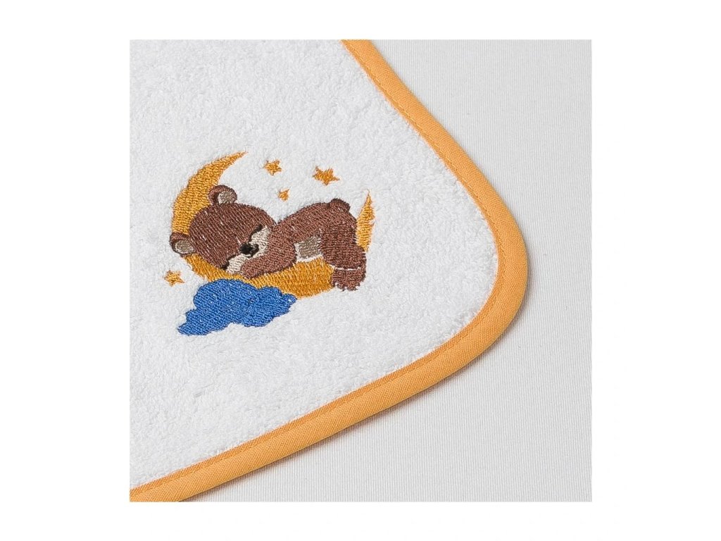 Dětský slintáček Veba LOTA bílá s výšivkou Méďa v oblacích zlatá lemovka