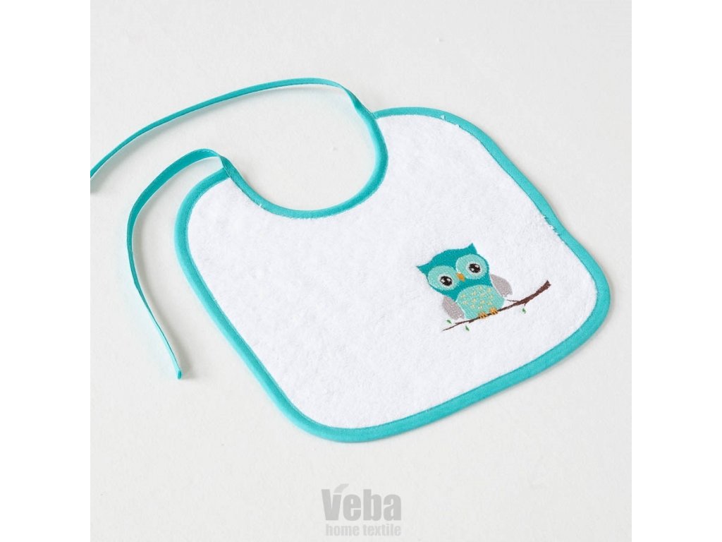 Roztomilá sovička na bílém slintáku s tyrkysovou lemovkou. Materiál - kvalitní froté pletenina s bezkonkurenční savostí, jejíž předností je lehkost...